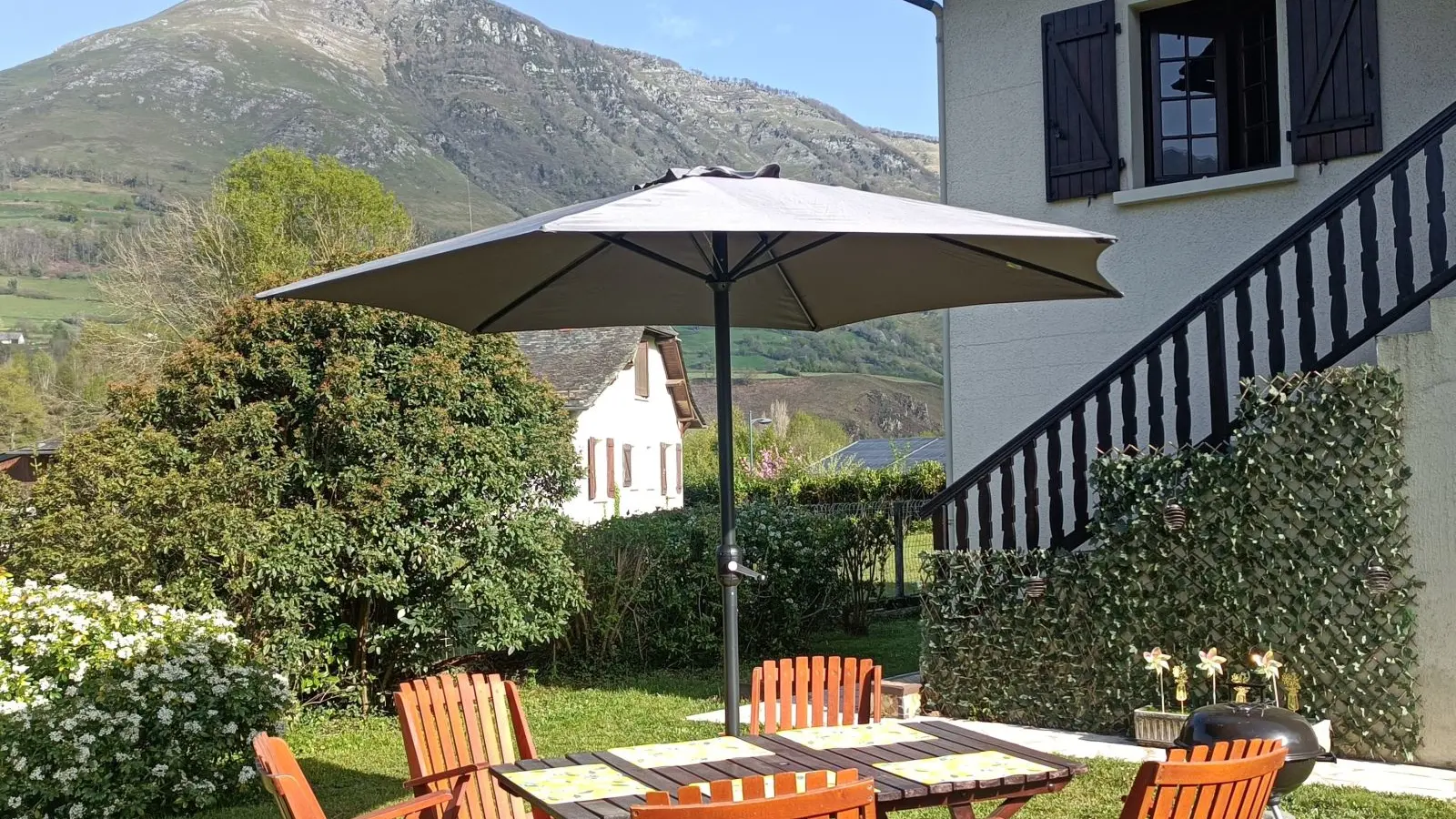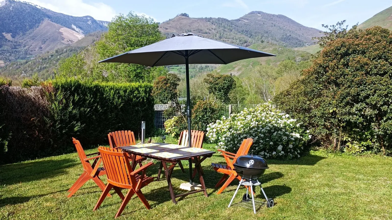 Un jardín con muebles y barbacoa está disponible para momentos de relax con vistas a las montañas.